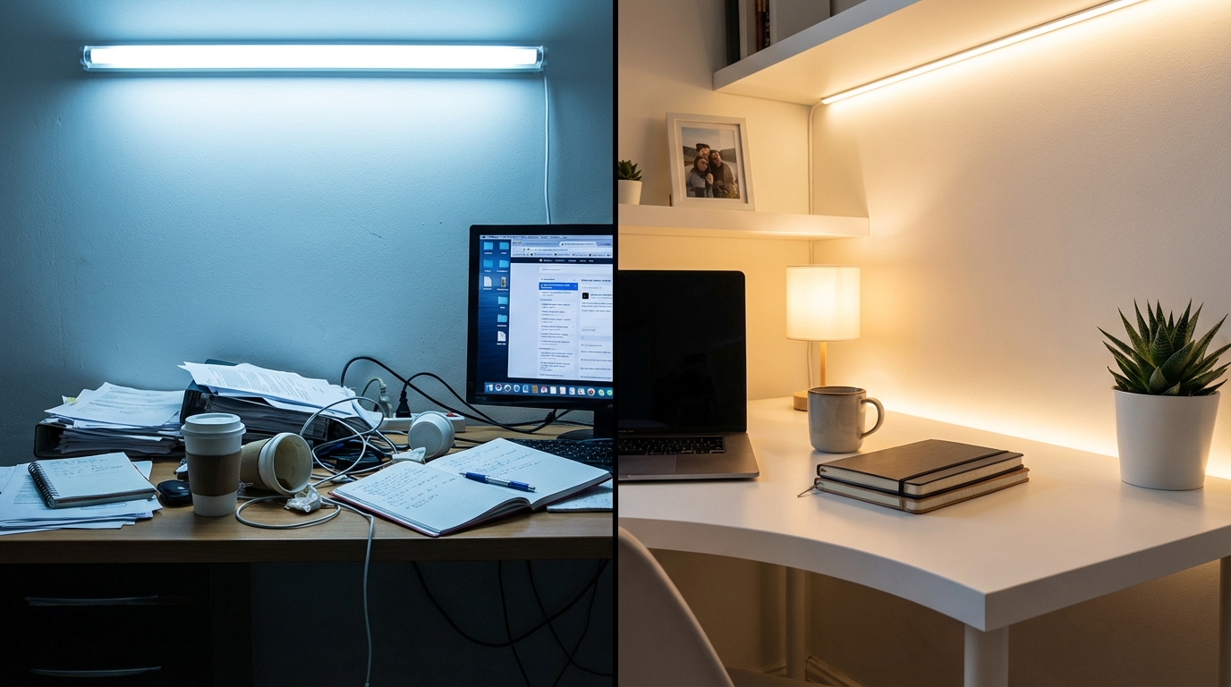 - Poor lighting (too dim, or harsh cool-white overhead light) elevates cortisol and reduces sustained attention over time